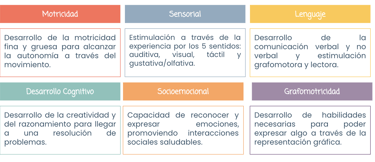 Trabajamos 6 áreas importantísimas, cada una en el nivel adecuado según los hitos de desarrollo de la generación: